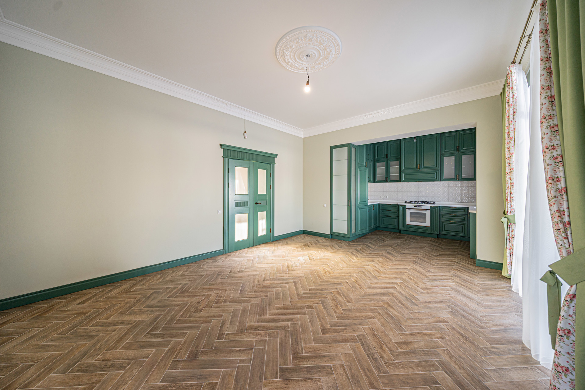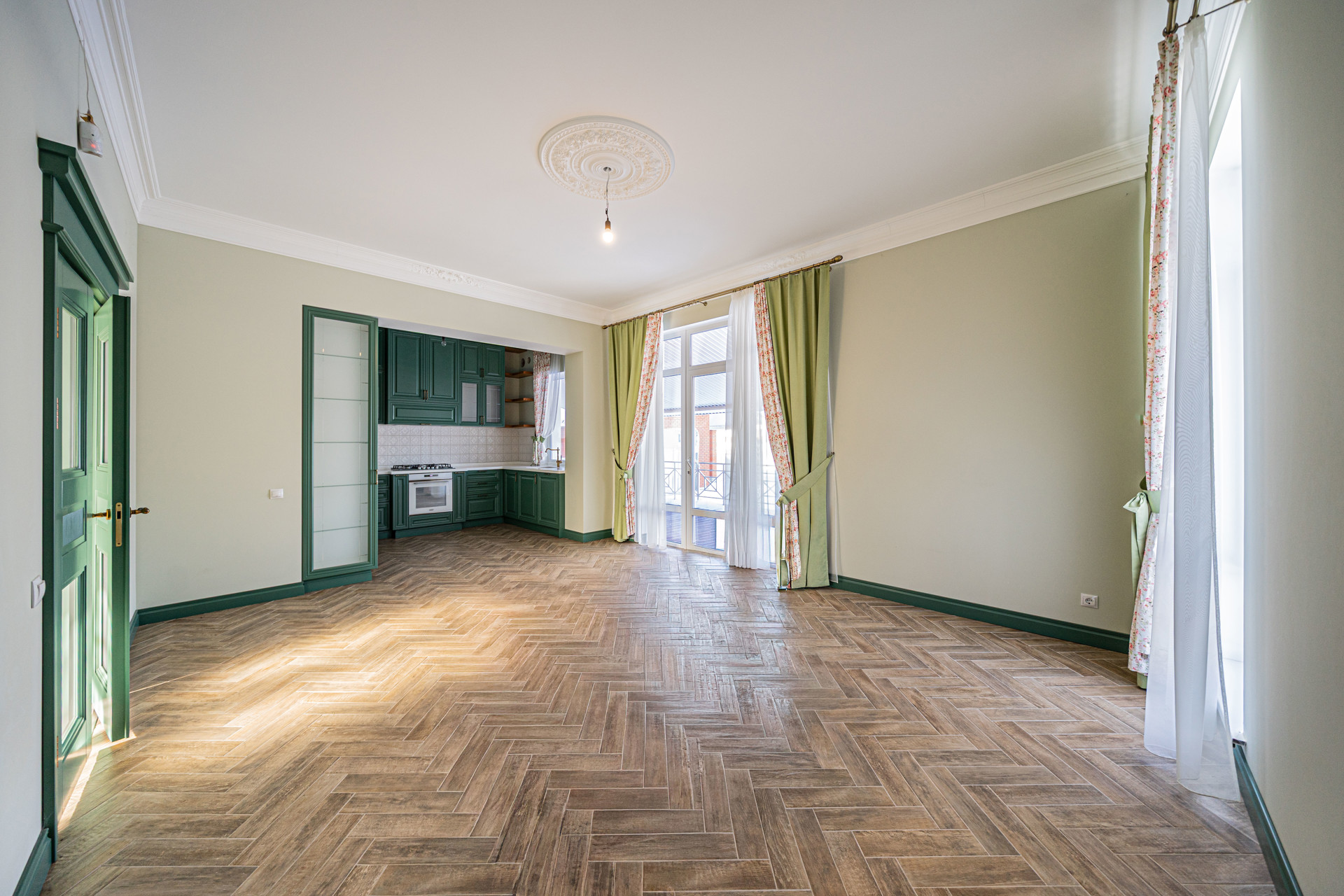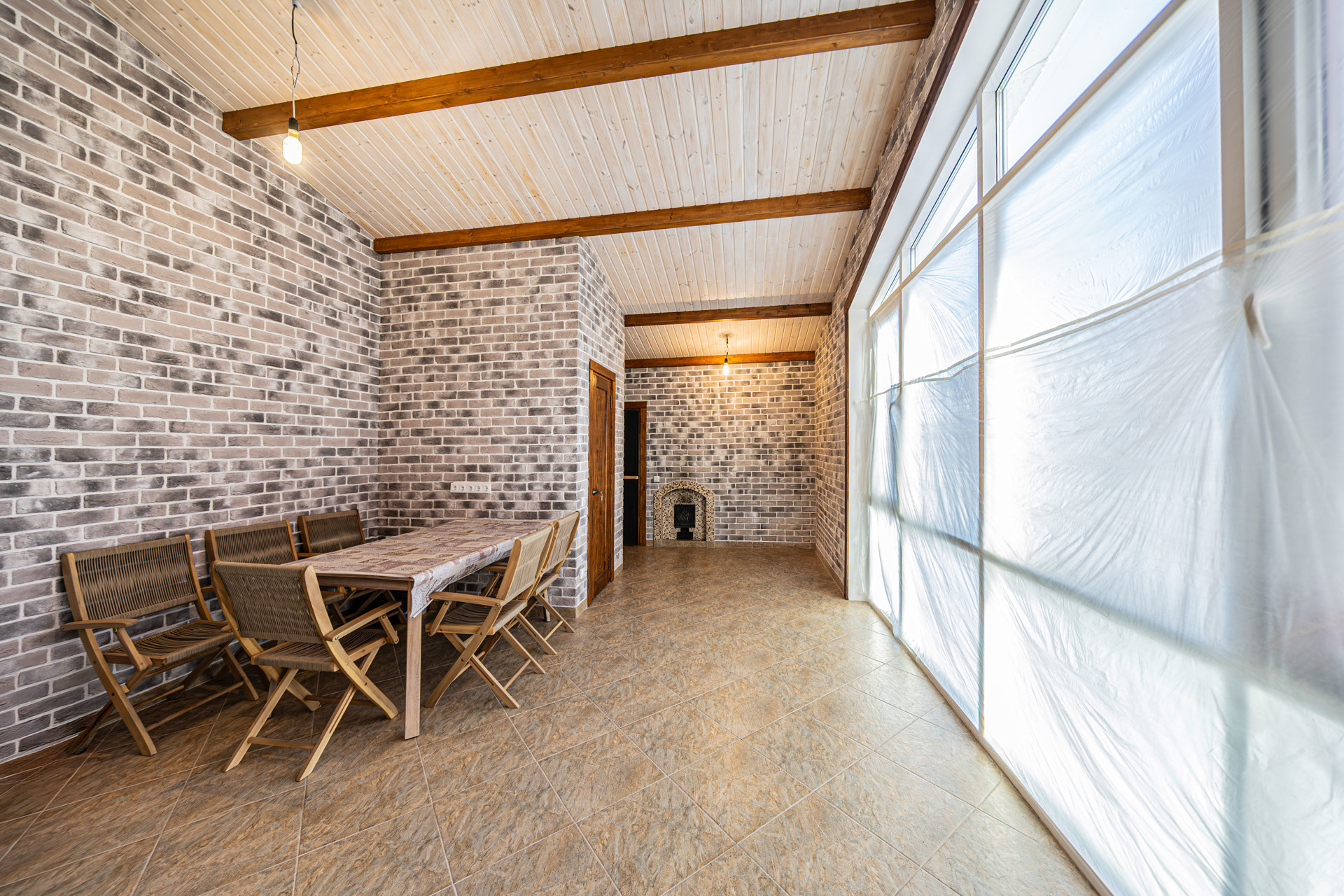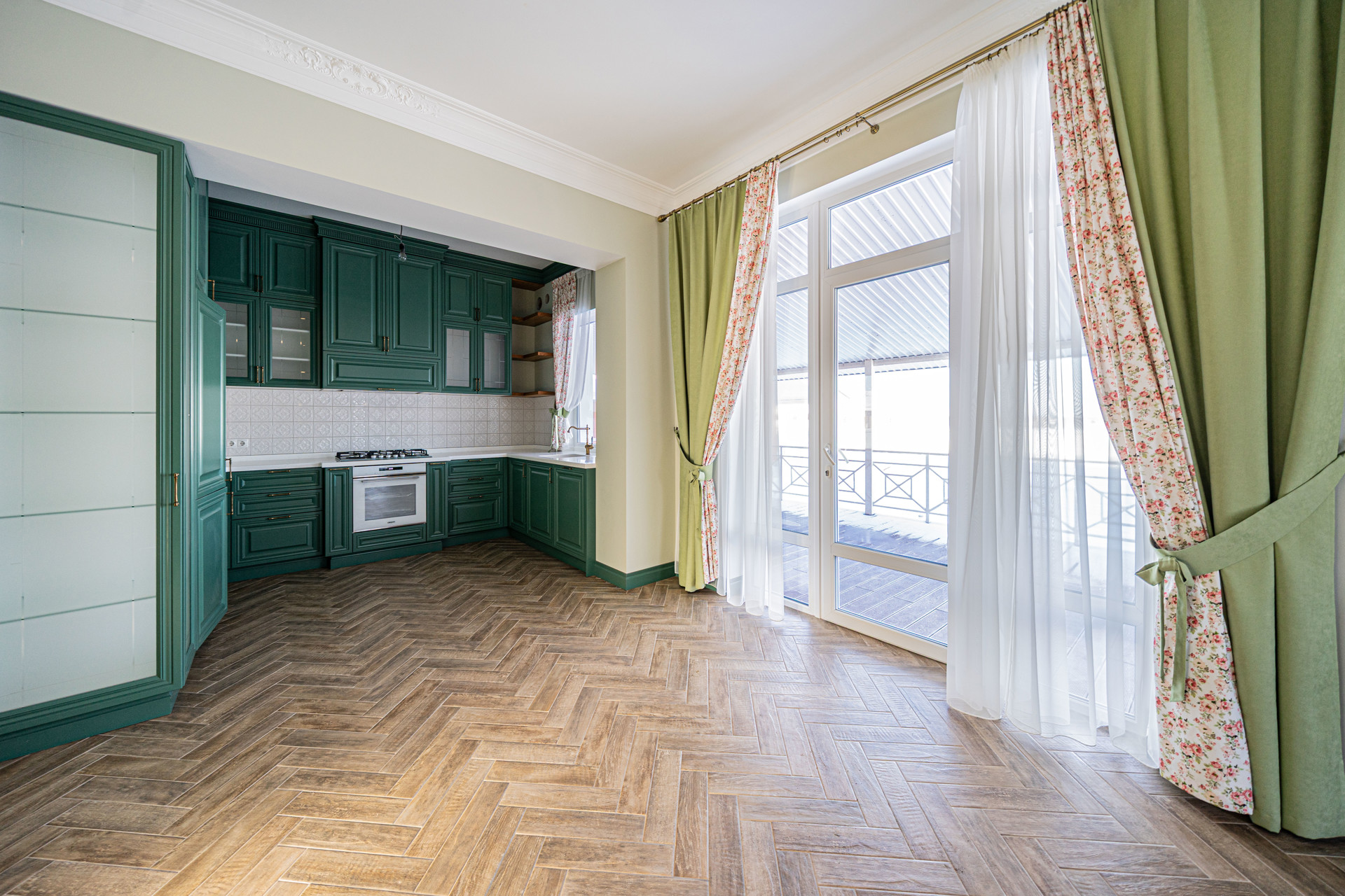 Светлая кухня-гостиная с выходом на веранду,