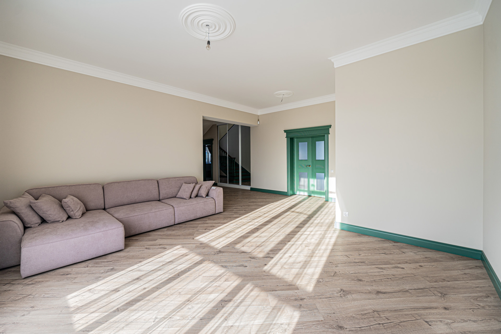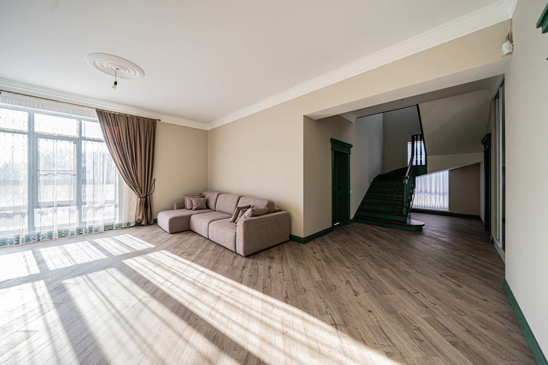 Первый этаж — просторная солнечная гостиная,
